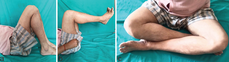 Figure 5: (a, b, c) Clinical follow-up showing knee range of motion, no posterior sag, and cross-leg sitting.
