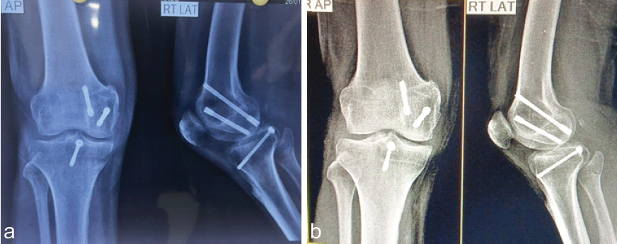 Figure 6: (a and b) Radiographic follow-up at 6 months and 18 months showing healed fracture.