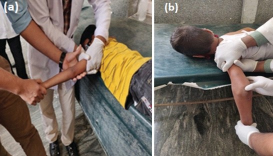 Figure 2: Traction, (a) Traction at forearm and countertraction at axilla, (b) Elbow slowly flexed with thumb centered on olecranon and other fingers encircling proximal fragment.