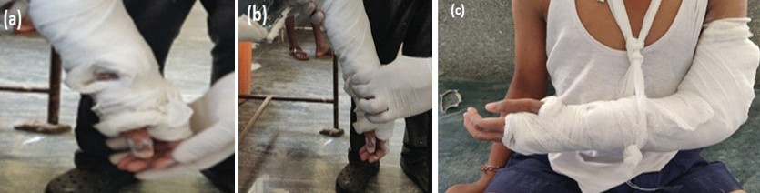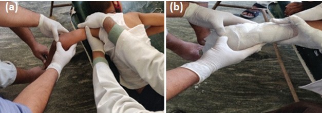 Figure 3: Reduction and splint/slab application, (a) Second assistant takes over to provide traction and the surgeon now reduces the fracture with both thumbs on olecranon and other fingers encircling proximal fragment to reduce the fracture, (b) Above elbow splint/slab applied.