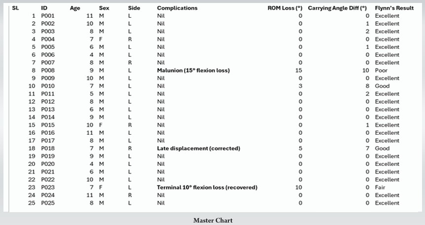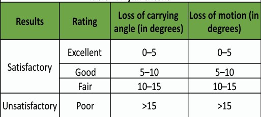 At the end of 1 week, after confirming maintenance of reduction with X-ray, conversion to above elbow cast was done. At the end of week 3 or when the fracture clinically united, cast was removed and joint mobilized. Further follow-up was done at 6, 12, and 24 weeks. Flynn criteria (Table 1) were used to measure functional outcome and Baumann angle for radiological outcome. The Statistical Package for the Social Sciences version 27 software and Microsoft office were utilized to analyze data.