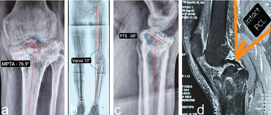 Figure 2: X-rays of left knee. (a) Anteroposterior view demonstrating MPTA 76.9° and (b) scanogram-varus 10°. (c) Lateral View: posterior (reverse) tibial slope −30°. The posterior tibial slope was quantified relative to the anatomic axis of the tibia, established by connecting mid-diaphyseal reference points located approximately 5 cm and 15 cm distal to the tibial plateau, each defined at the midpoint between the anterior and posterior cortical borders on the sagittal plane, and (d) magnetic resonance imaging showing intact PCL.