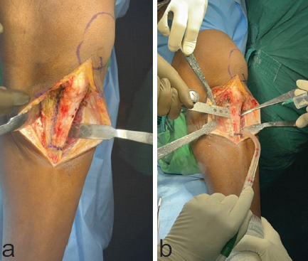 Figure 3: Left knee. (a) Exposure of tibial tuberosity with elevation of full thickness flap medially and laterally and (b) osteotomy of the tibial tubercle using saw.