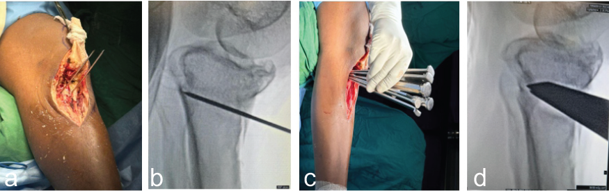 A 7-cm segment of the tibial tubercle, maintaining appropriate width and thickness, was mobilized, along with the attached patellar tendon as a single unit. This segment was wrapped in gauze soaked with vancomycin and retracted proximally for protection (Fig. 4a). With the knee flexed to 30° and posteriorly supported, a C-arm was used to obtain a lateral fluoroscopic view. The proximal tibial osteotomy site was identified 3 cm below the joint line. Two parallel monocortical K-wires were inserted obliquely under fluoroscopic guidance, starting from distal to proximal along the visible previous fracture line and parallel to posterior tibial slope, either side of the tibial tubercle bed. These wires were advanced until they abutted the posterior tibial cortex, aiming for a point ending with previous fracture line, approximately 2.5 cm distal to the joint line, as verified by fluoroscopy (Fig. 4a and b). After the osteotomy lines were completed using a power saw, osteotomes were gently used to reach close-within approximately 5 mm-to the posterior cortex across the full transverse diameter of the tibia. Care was taken to preserve the posterior cortex and avoid fracture propagation. To facilitate controlled opening of the osteotomy, multiple 2.5 mm drill holes were placed at the intended hinge area in the posterior cortex to soften it. Multiple stacked osteotome was introduced anteriorly to gradually open the osteotomy site (Fig. 4c and d).