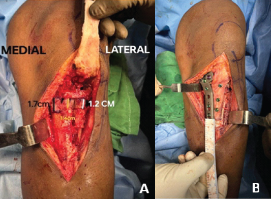 Under fluoroscopic control, the medial side was opened more to achieve the desired coronal plane correction based on pre-operative planning. To maintain the created gap, wedge-shaped tricortical autografts harvested from the iliac crest. Graft was prepared in differential manner and inserted accordingly to correct varus along with slope. A 17-mm-thick graft was placed on the medial side to provide medial column support, while a 12-mm-thick graft was positioned laterally. A central block of 14 mm thickness was interposed between the two to stabilize the construct (Fig. 5a). The osteotomy was stabilized using a high tibial osteotomy (HTO) plate (Fig. 5b). Finally, the previously elevated tibial tubercle was reattached using a cancellous screw, ensuring restoration of appropriate patellar height and alignment and avoiding patella baja (Fig. 5b). Fixation of tibial tuberosity itself acts as a biological plate providing stability to osteotomy site.
