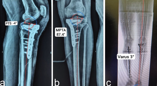 On post-operative radiograph, there is marked correction of deformity in both planes with residual varus of mere 3° with MPTA-87.4°, whereas tibial slope was restored up to −4° (Fig. 6a, b, c).