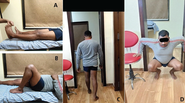 Figure 7: At 3-month post-operative. (a) Restoration of physiological heel height with no clinical evidence of knee hyperextension deformity. (b) Achieved functional knee range of motion from 0° extension to 130° flexion. (c) Ambulating with a stable gait pattern and without evidence of dynamic varus thrust. (d) Able to perform squatting and sit-to-stand maneuvers comfortably, indicating satisfactory quadriceps control and functional knee flexion.