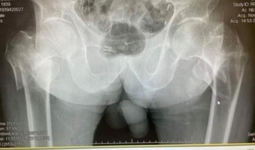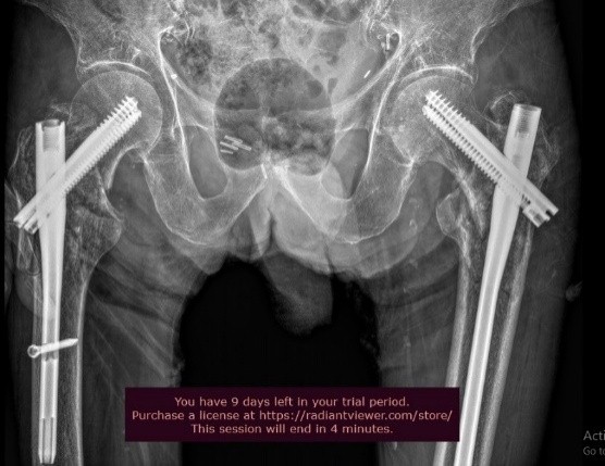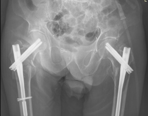 Figure 1: Anteroposterior view of the pelvis. Right intertrochanteric fracture. Left subtrochanteric fracture.