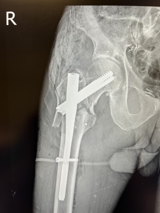 Figure 2: First post-operative day radiographic control of the right hip. Closed reduction and intramedullary fixation (InterTan 10×200).