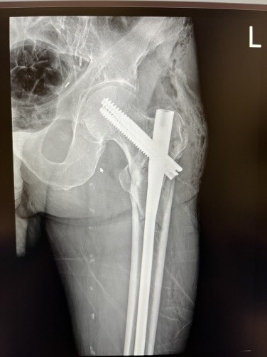 Figure 3: First post-operative day radiographic control of the left hip. Open reduction and intramedullary fixation (InterTan 10×400).