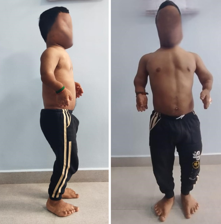 Clinical examination revealed disproportionate short stature (height 132 cm) with short limbs, a relatively long trunk, frontal bossing, and a depressed nasal bridge (Fig. 1).