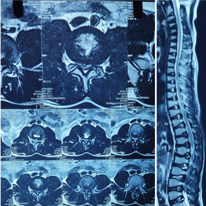 Neurological examination showed bilateral weakness of the extensor hallucis longus (EHL) with motor power of 2/5 in the L5 myotome on both sides; all other myotomes had normal strength (5/5). Sensory examination demonstrated intact light touch, vibration, and proprioception in both lower limbs, with normal perianal sensation and voluntary anal contraction. Bowel and bladder functions were preserved.