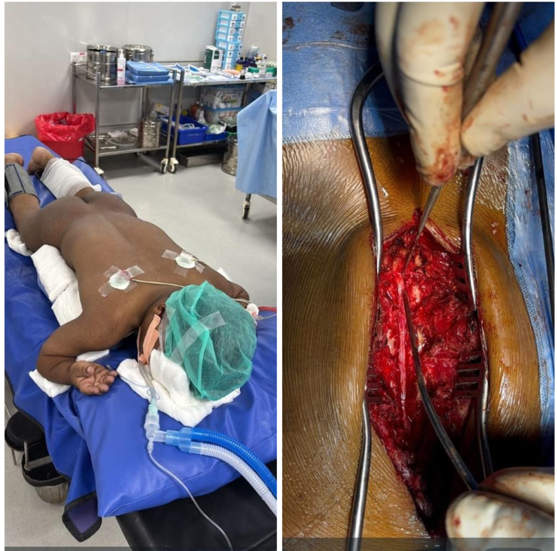 Figure 4: (Left to right) prone position with vertical bolster with adequate paddings, intraoperative images show L1-L5 facet sparing laminectomy.