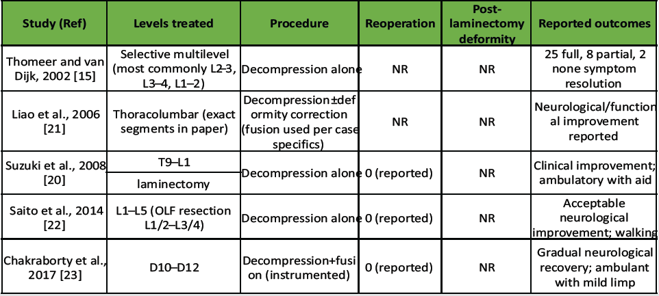 Table 1: Summary of published studies reporting outcomes of decompression for thoracolumbar/lumbar ossification of the ligamentum flavum