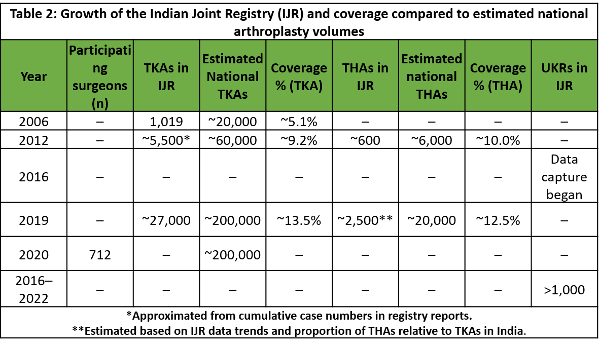 A persistent challenge for the IJR remains incomplete coverage, with only a small fraction of national arthroplasty procedures captured. Addressing this gap requires coordinated efforts not only from surgeons and policymakers but also from industry partners who hold a leadership position in the Indian arthroplasty space. Implant companies such as Zimmer Biomet, Stryker, Smith and Nephew, Johnson and Johnson (DePuy Synthes), Meril, and Biorad are uniquely placed to support registry growth. Their company sales representatives and operating theater assistants, who are routinely present during surgeries to handle implant boxes, can be engaged in assisting with real-time data capture. These representatives could ensure that implant details and demographic information are accurately entered into the registry at the point of care. Making such participation a compulsory internal compliance requirement would standardize reporting and substantially reduce under-reporting.