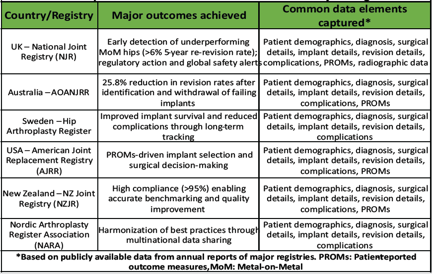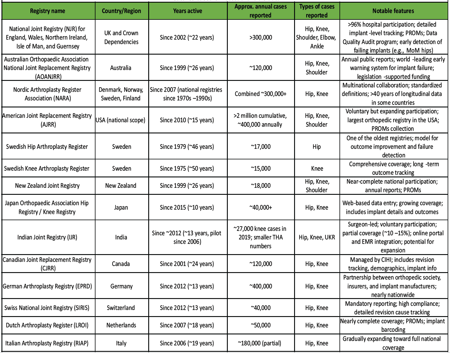 Around the world, national joint registries have demonstrated immense value in improving orthopedic outcomes and patient safety (Table 1).