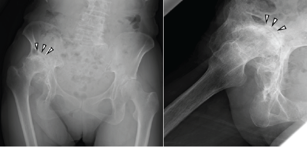 Figure 1: Radiographs at the first visit (left, anteroposterior view; right, lateral view). The images reveal high dislocation of the right hip, deformity of the femoral head, and severe narrowing of the joint space (arrowheads).