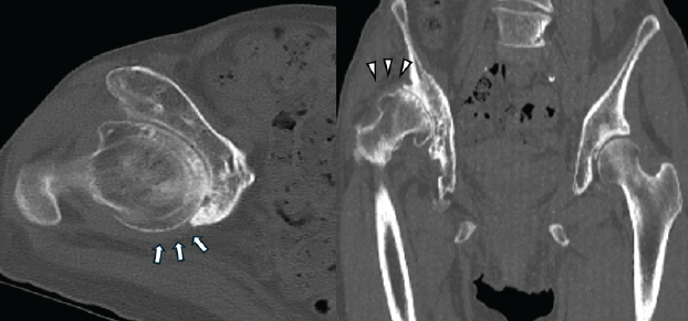 Figure 2: Pre-operative computed tomography images (left, axial view; right, horizontal view). The axial view shows excessive anterior acetabular coverage and a posterior wall defect (arrows). The horizontal view shows a severe bone defect in the superior aspect of the acetabulum, corresponding to the weight-bearing region (arrowheads).