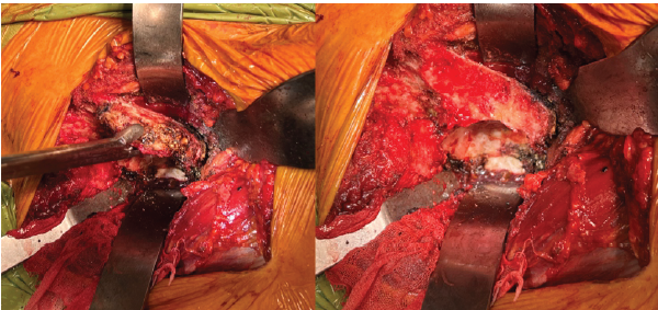 Figure 3: Intraoperative findings. Excessive anterior wall coverage and extensive osteophyte formation surrounding the acetabulum are observed (left panel). The anterior over coverage is removed and the acetabular is exposed (right panel).