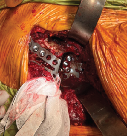 Figure 4: Placement of the GAP II ring. The hook is inserted into the acetabular floor, and the reinforcement ring is securely fixed using multiple screws.