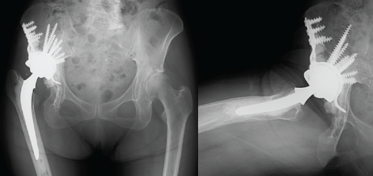 As anticipated, soft-tissue contracture obstructed the reduction of the femoral head component into the original acetabular socket. Because the hook of the reinforcement ring could not reach the obturator foramen, the acetabular floor was excavated, and the reinforcement ring was positioned more superiorly within the ilium. Due to bone fragility, bone grafting was deemed unsuitable; thus, the gap between the reinforcement ring and the acetabulum was filled with bone cement. Fifteen screws were placed into the acetabulum in all directions except the defective posterior region (Fig. 4 and 5).
