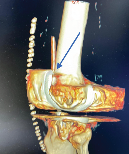 Figure 3: 3D computed tomography scan showing the point of impingement (indicated by blue arrow).