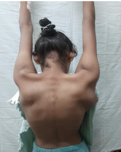 Figure 1: Preoperative clinical photograph from the back showing a large lobulated swelling over the dorsal aspect of the right scapula, causing visible posterior asymmetry and pseudowinging.