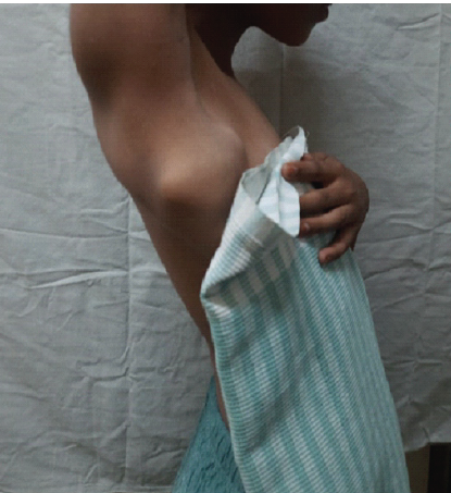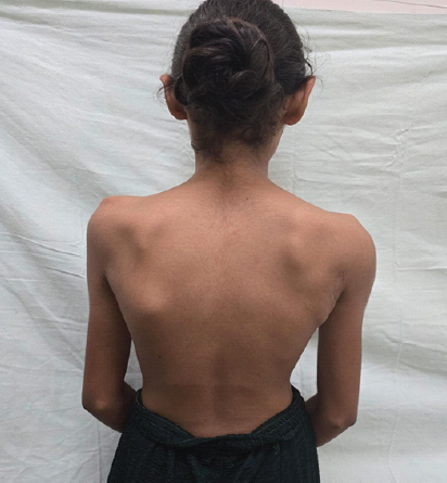A 12-year-old female presented to our orthopedic clinic with complaints of a large, hard swelling over the right scapular region and difficulty in lying on the affected side. The swelling was noted since the age of 7 years and gradually increased in size over the years, becoming symptomatic in the past year with difficulty in lying on the affected side.