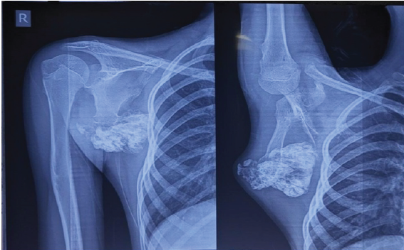 Figure 3: Preoperative shoulder radiograph (antero-posterior and scapular Y views) showing a large, well-circumscribed, pedunculated bony mass arising from the inferior angle of the right scapula.