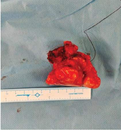 Figure 4: Gross image of the excised tumor with multilobulated surface and cartilaginous cap, placed next to a scale for reference (approx. 6 cm).
