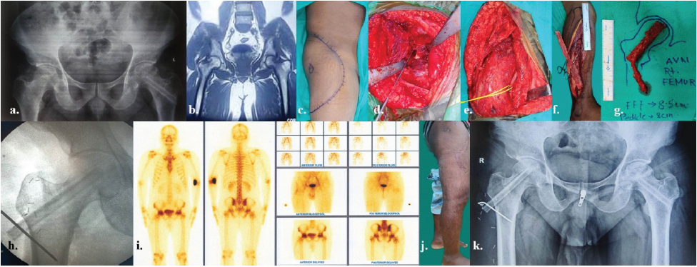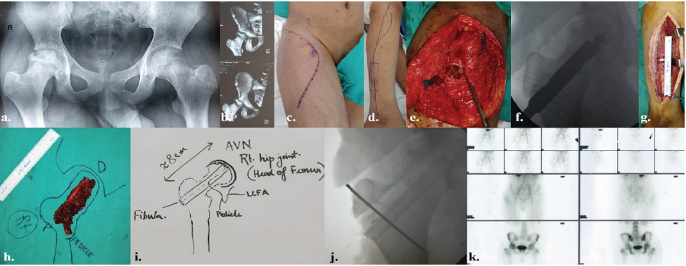 Figure 2: The details of rt. osteonecrosis of femoral head in a 29-year-old male as a sequela to high dose of corticosteroid during COVID-19 – (a) pre-operative skiagram pelvis anteroposterior view with previously operated lt. AVN femur with non-vascularized bone graft done outside, presently complaining of pain in rt. hip; (b) pre-operative computed tomography-scan of pelvis; (c) pre-operative marking of incision on rt. Hip and upper thigh; (d) intra-operative coring of rt. Femoral head; (e) intra-operative picture of recipient vessel- descending branch of circumflex femoral vessels, dissected and looped in yellow tape; (f) intraoperative fibula harvest; (g) planning and orientation of fibula after flap detachment; (h) intraoperative picture of image intensifier after introduction of fibula and fixation with K-wire; (i) Tc99m scan after 3 months showing symmetrical uptake of tracers on both femoral heads with mild increased uptake on right side; (j) Post-operative follow-up after 3 months; and (k) post-operative follow-up skiagram pelvis AP view after 3 months showing bone uptake.