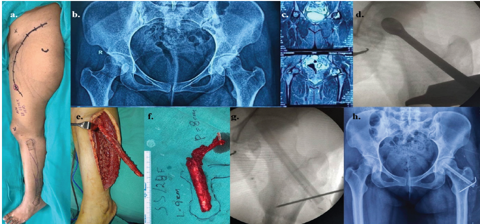 Figure 3: The details of lt. osteonecrosis of femoral head in a 27-year-old female as a sequela to high dose of corticosteroid during COVID-19 – (a) pre-operative picture of the lt. hip and lower extremity with the marked incisions; (b) pre-operative skiagram pelvis anteroposterior (AP) view; (c) pre-operative computed tomography-scan of pelvis; (d) intraoperative image intensifier view of the reamer inside the lt. Femoral head; (e) intraoperative fibula harvest; (f) planning and orientation of fibula after flap detachment; (g) intraoperative picture of image intensifier after introduction of fibula and fixation with K-wire; and (h) post-operative follow-up skiagram pelvis AP view after 3 months.