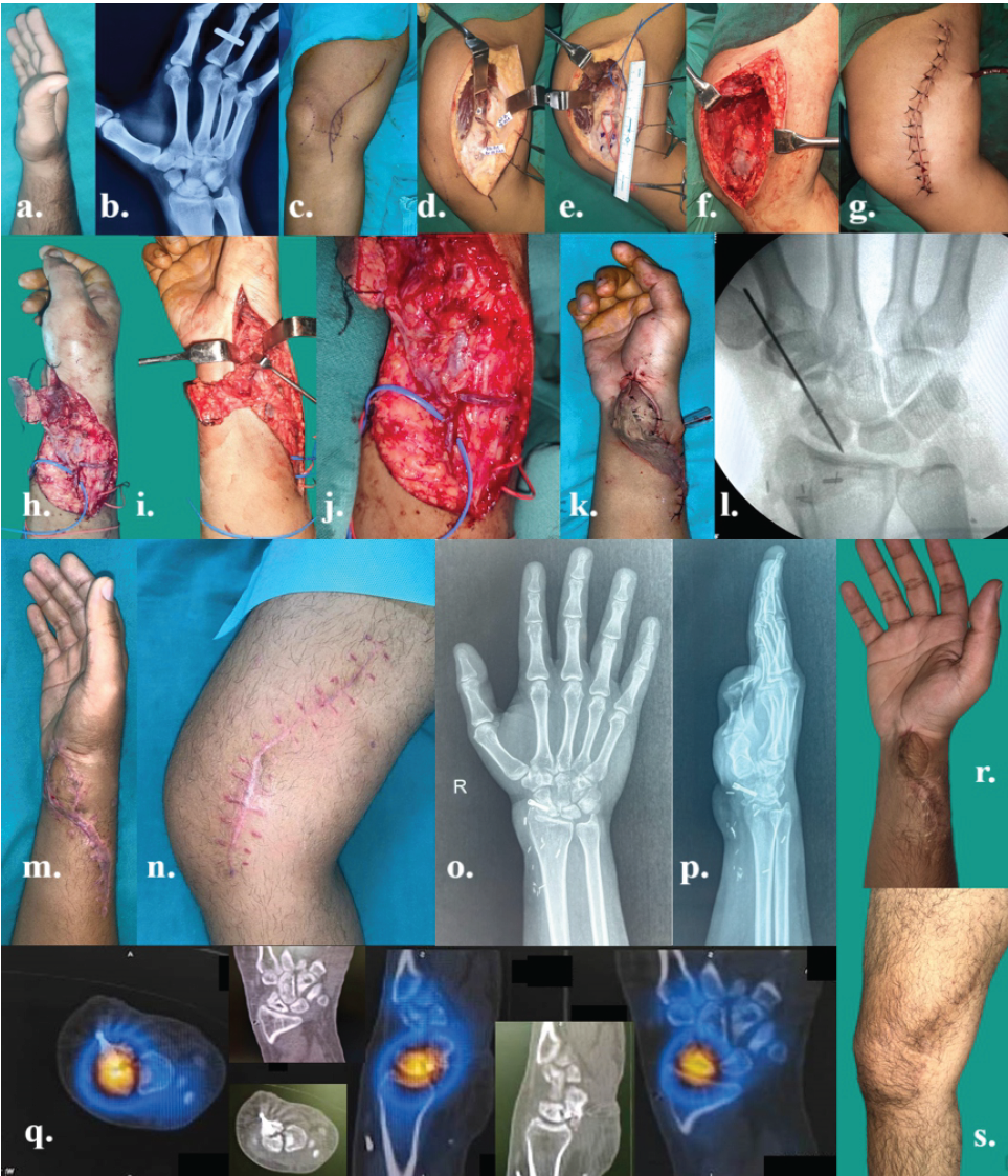 Figure 4: The details of AVN scaphoid of rt. hand in a 21-year-old male – (a) pre-operative picture of rt. hand; (b) pre-operative skiagram anteroposterior (AP) view of rt. hand with wrist joint; (c) pre-operative marking of vascularized rt. Medial femoral condyle (MFC) flap; (d-g) intraoperative vascularized MFC flap harvest and closure of donor area; (h-j) osteocutaneous flap inset after exploration of rt. scaphoid and recipient vessels looped in blue tape; (k) after flap inset and remnant of defect closed with skin graft; (l) image intensifier view of fixation with Herbert screw (permanent) and temporary single K-wire; (m and n) post-operative views of recipient and donor areas after 6 weeks; (o and p) 6 weeks post-operative views of skiagram (AP and lateral) rt. hand; (q) Tc99m scan after 6 weeks showing good uptake of tracers indicating viable bone transfer; and (r and s) long term post-operative pictures of rt. hand and rt. knee donor area after 6 months.
