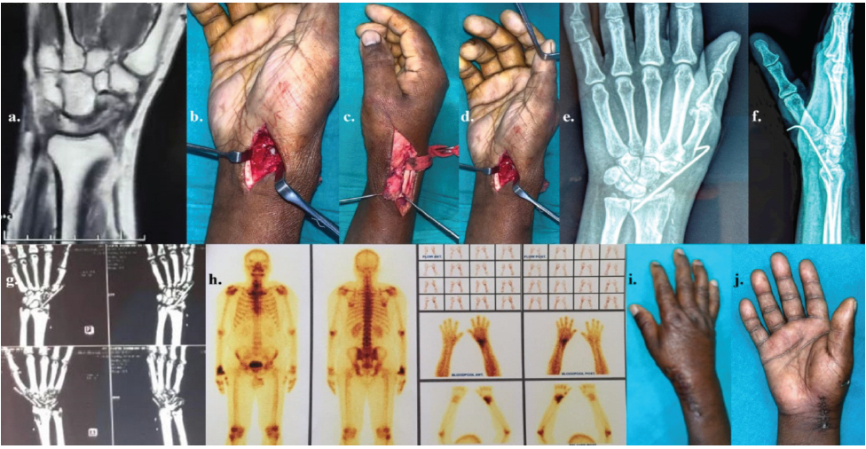 Figure 5: The details of AVN scaphoid of rt. hand in a 47-year-old male – (a) pre-operative computed tomography (CT) scan of rt. Wrist; (b) surgical approach to rt. Scaphoid and defect after debridement of necrotic bone; (c) harvest of vascularized segment of rt. distal radius based on 1,2 intercompartmental supra-retinacular artery; (d) transfer of pedicled distal radius to the defect in scaphoid; (e and f) post-operative radiograph showing bone graft fixed with K-wire; (g) CT-scan images with 3D reconstruction rt. Wrist in 6 weeks post-operative follow-up period showing partial resorption of bone; (h) Tc99m scan after 6 weeks showing increased uptake of tracers indicating viable bone transfer; and (i and j) showing post-operative 2-month follow-up.