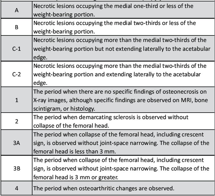 - 1. Sugano N, Atsumi T, Ohzono K, Kubo T, Hotokebuchi T, Takaoka K. The 2001 revised criteria for diagnosis, classification, and staging of idiopathic osteonecrosis of the femoral head. J Orthop Sci. 2002;7(5):601-5. doi: 10.1007/s007760200108. PMID: 12355139. [Google Scholar]