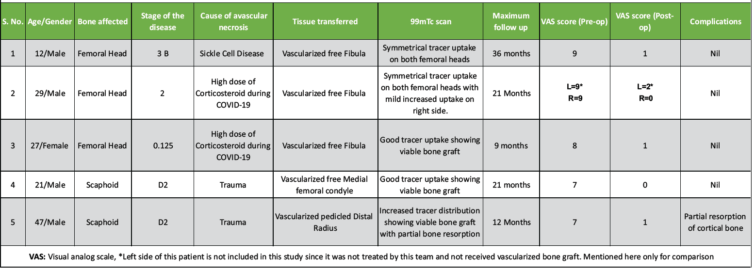 Materials and Methods: In a duration of 2 years, five patients were treated for such pathologies using vascularized bones (pedicled or free). All of them were subjected to radioisotope (Technetium 99m) scan postoperatively to evaluate the viability of the transferred bones. The post-operative pain was assessed using visual analog scale (VAS) to assess the outcome of treatment by comparing the score before and after surgery.