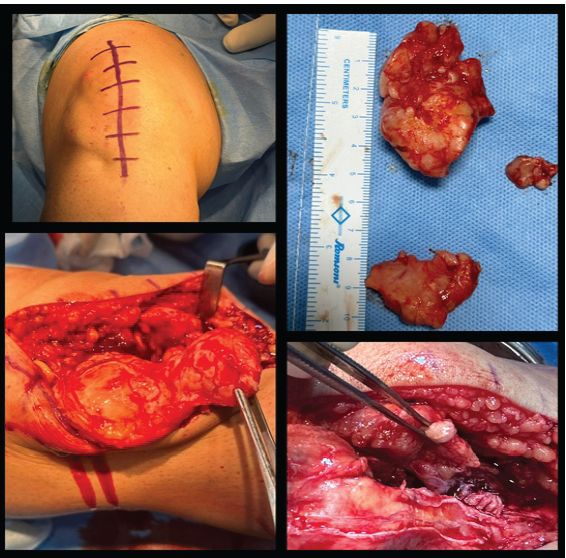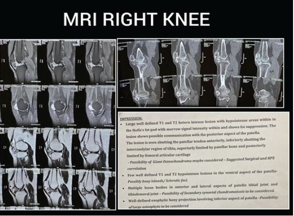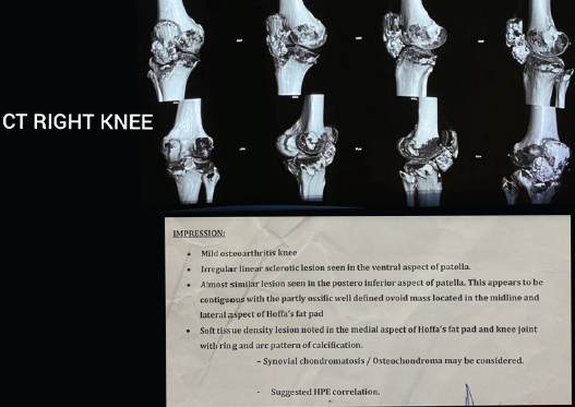 Computed tomography scan confirmed the continuity. Soft-tissue density lesion noted in the medial aspect of Hoffa’s fat pad and knee joint with multiple loose bodies in anterior and lateral aspects of patella-tibial joint and tibiofemoral joint (Fig. 3). Synovial chondromatosis/osteochondroma may be considered. Diagnosis was based on clinical and imaging findings: An osteochondroma of the posterior aspect of patella was confirmed. Given the patient’s significant symptoms and the impact on her daily activities, surgical excision was deemed necessary. Surgical procedure: A medial parapatellar approach was used to access the lesion [6,7]. Excision: The osteochondroma was excised en bloc, ensuring complete removal of the cartilaginous cap. Intraoperative findings were consistent with pre-operative imaging. The wound was irrigated and closed in layers. Hemostasis was achieved, and the extensor mechanism was carefully preserved (Fig. 4).