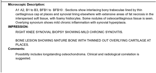 Post-operative care: The patient was placed in a knee immobilizer post-surgery. Pain management was achieved with oral analgesics. Patient was encouraged early mobilization with gentle knee bending and quadriceps and hamstring exercises from pod 5. The patient was discharged with instructions for routine wound care and follow-up. At the 6-week follow-up, the patient reported marked reduction in pain and improved knee function. Physical examination showed no signs of recurrence, and the surgical site was healing well. Radiographs confirmed the absence of residual lesion. Histopathological diagnosis confirmed possibility of osteochondroma with chronic synovitis with thinned out overlying cartilage (Fig. 5).