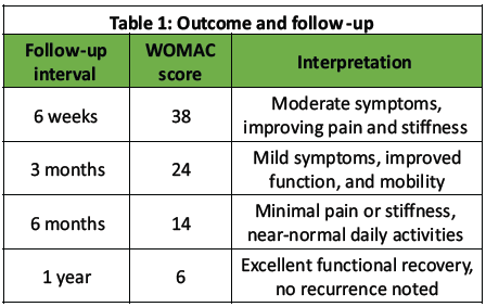 At the 6-week follow-up, the patient reported a marked reduction in pain and improved knee function. Physical examination showed no signs of recurrence, and the surgical site was healing well. Radiographs confirmed the absence of residual lesion (Fig. 6) [Table 1].