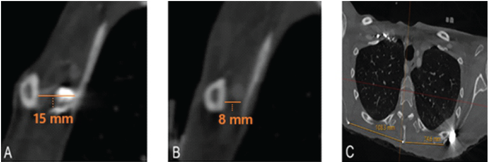 Figure 1: Computed tomography angiography imaging (a) of the chest showing the normal costoclavicular interval on the unaffected right side (15 mm), (b) narrowing on the affected left side (8 mm), and (c) medialization of the left scapula noted relative to the right side, as well as narrowing of the costoclavicular interval on the left side.