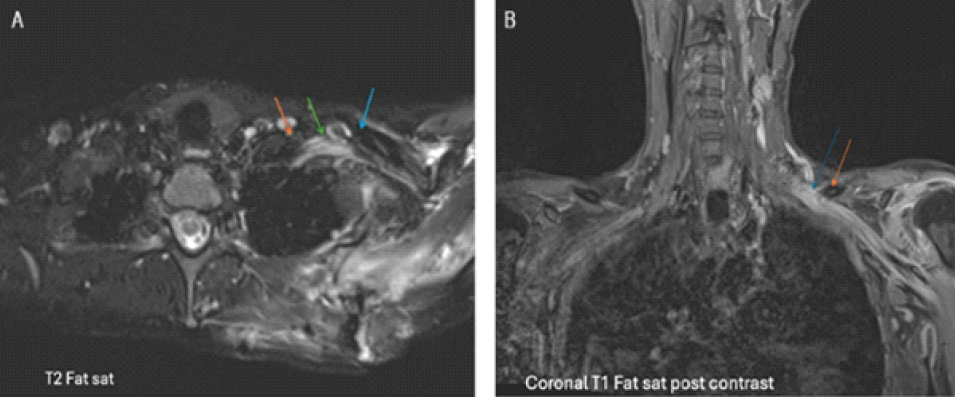 Figure 2: (a) Axial T2FS: Edematous and posteriorly angled left brachial plexus nerves (green arrow) coursing distally, inferior to the clavicle (blue arrow). Lateral interscalene area (orange arrow). (b) Coronal T1FS: Enhancement of the left brachial plexus (blue arrow), extending from proximal to the clavicle (orange arrow) distally.