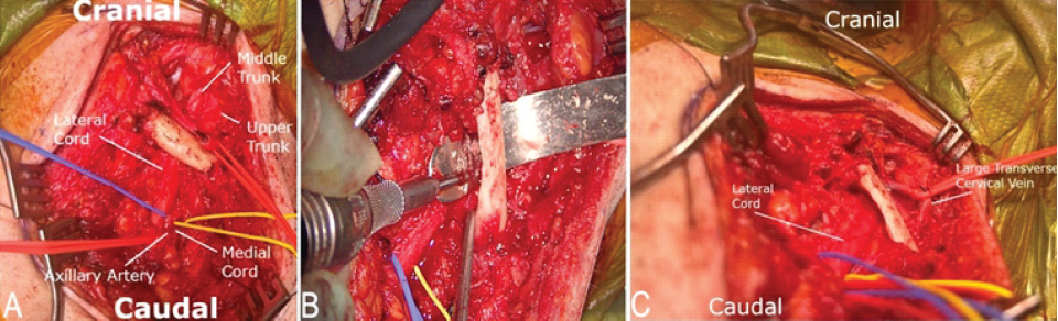Figure 3: (a) Exposure of the supraclavicular and infraclavicular brachial plexus, with downward stretch of the brachial plexus by the clavicle. (b) High-speed drill used to perform dorsal claviculectomy, with a malleable retractor protecting the retroclavicular neurovascular elements. (c) Relief of the brachial plexus downward stretch following dorsal claviculectomy.