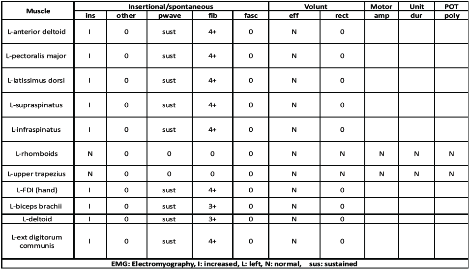 Further diagnostic studies were performed. Nerve conduction studies showed the absence of median, ulnar, and radial sensory responses, and decreased amplitude of median and ulnar motor responses. An electromyography study showed profuse active denervation with no motor units throughout the muscles of the entire LUE (Table 1).