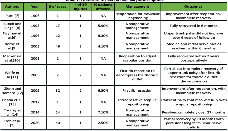 The goal of scapulothoracic fusion is to improve shoulder stability or correct a deformity (depending on the indication) by fixating the scapula to the chest wall. The procedure carries certain risks, including failure to improve symptoms, failure to fuse, reduced shoulder mobility, pneumothorax, cosmetic issues, and neurovascular injury including BP injury [3]. We present a case report of a patient treated with pan BP injury following scapulothoracic fusion. The injury failed to improve with repositioning of the scapula and was treated using a novel approach: Dorsal claviculectomy. We also provide a review of the literature on BP injuries related to scapulothoracic fusion, as well as other previously described management strategies.