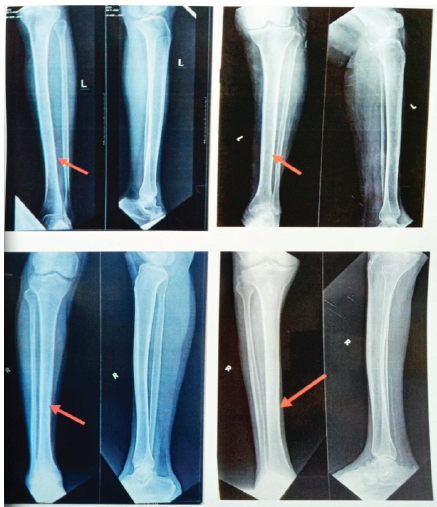 Figure 1: Examples of X-rays showing tibial isthmus (Isthmus is arbitrarily located at middle 1/3rd-distal 1/3rd junction of tibia at the narrowest portion of medullary canal. Isthmus is not located at a fixed point but varies from one individual to other).