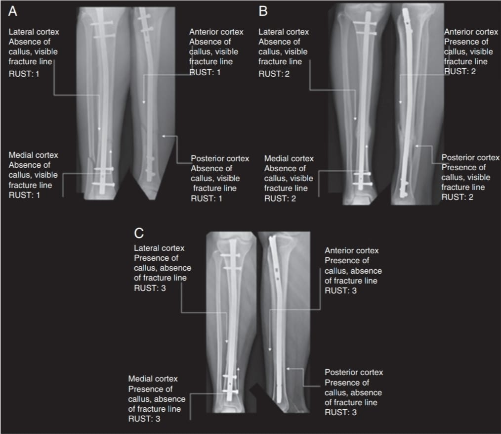 *Note: Using AP and lateral radiographs, the radiographic evidence of healing on at least three cortices was used to determine fracture union. The absence of radiographic signs of bone union and pain at the fracture site during weight-bearing after the 6th month following surgery were considered as indicator of non-union. Fig. 2 describes the overview of the RUST score [6]. Fig. 3 describes RUST score in three phases of consolidation [7].