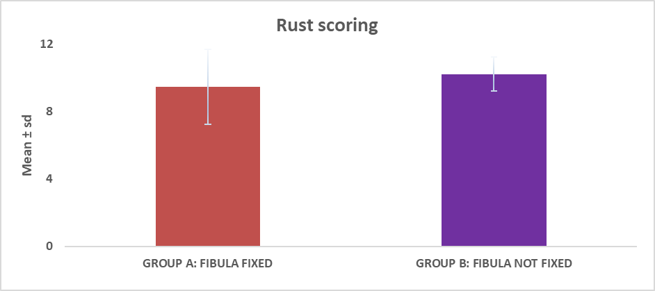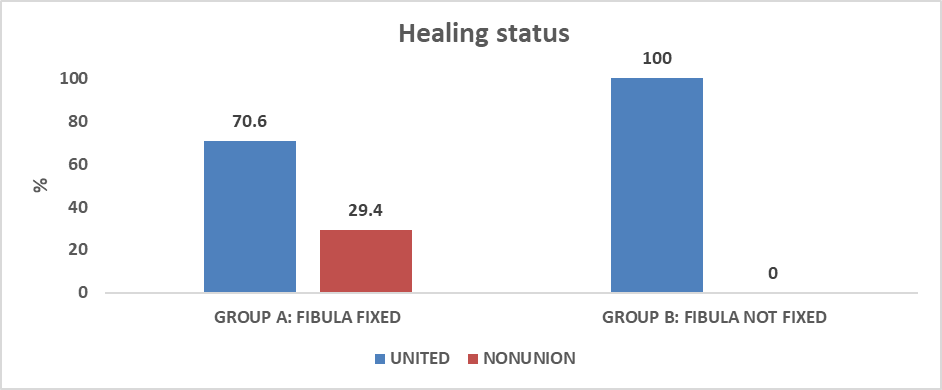 Results: Tibial bone union rate was better in the fibula not fixed (control) group compared to the fibula fixed group (P = 0.032), confirmed by the RUST scoring (P = 0.047), which was statistically significant.