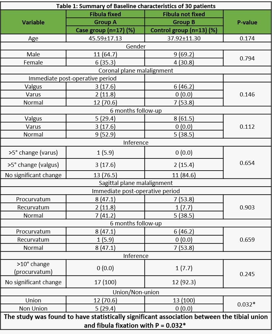 Materials and Methods: A prospective cohort study with a sample size of 30 patients was conducted in Sri Ramachandra Institute of Higher Education and Research between March 2023 and May 2024. Fibula fixation was done in one group, and the fibula was not fixed in the control group. Research methodology includes radiological evaluation for coronal and sagittal plane malalignment, Radiographic Union Score for Tibial fractures (RUST) scoring, and clinically, rotational malalignment and presence of post-operative infection. All cases were followed up for a minimum duration of 6 months to assess union of tibia fractures in both groups.