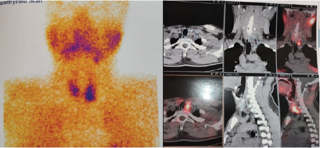 These findings were consistent with hyperfunctioning parathyroid adenoma involving the left inferior parathyroid gland, leading to the diagnosis of primary hyperparathyroidism. Both the endocrinologist and the head and neck surgeon consultations were done.