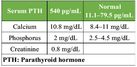 In the post-operative period, the patient underwent a series of investigations to assess his progress. After 3 months, the serum levels of parathyroid hormone (PTH) were 13.4 pg/mL, serum calcium = 11.1 mg/dL, and serum phosphorus = 2 mg/dL. Post-operative X-ray revealed the patella with a normal Insall Salvati ratio and stainless steel wire in situ.